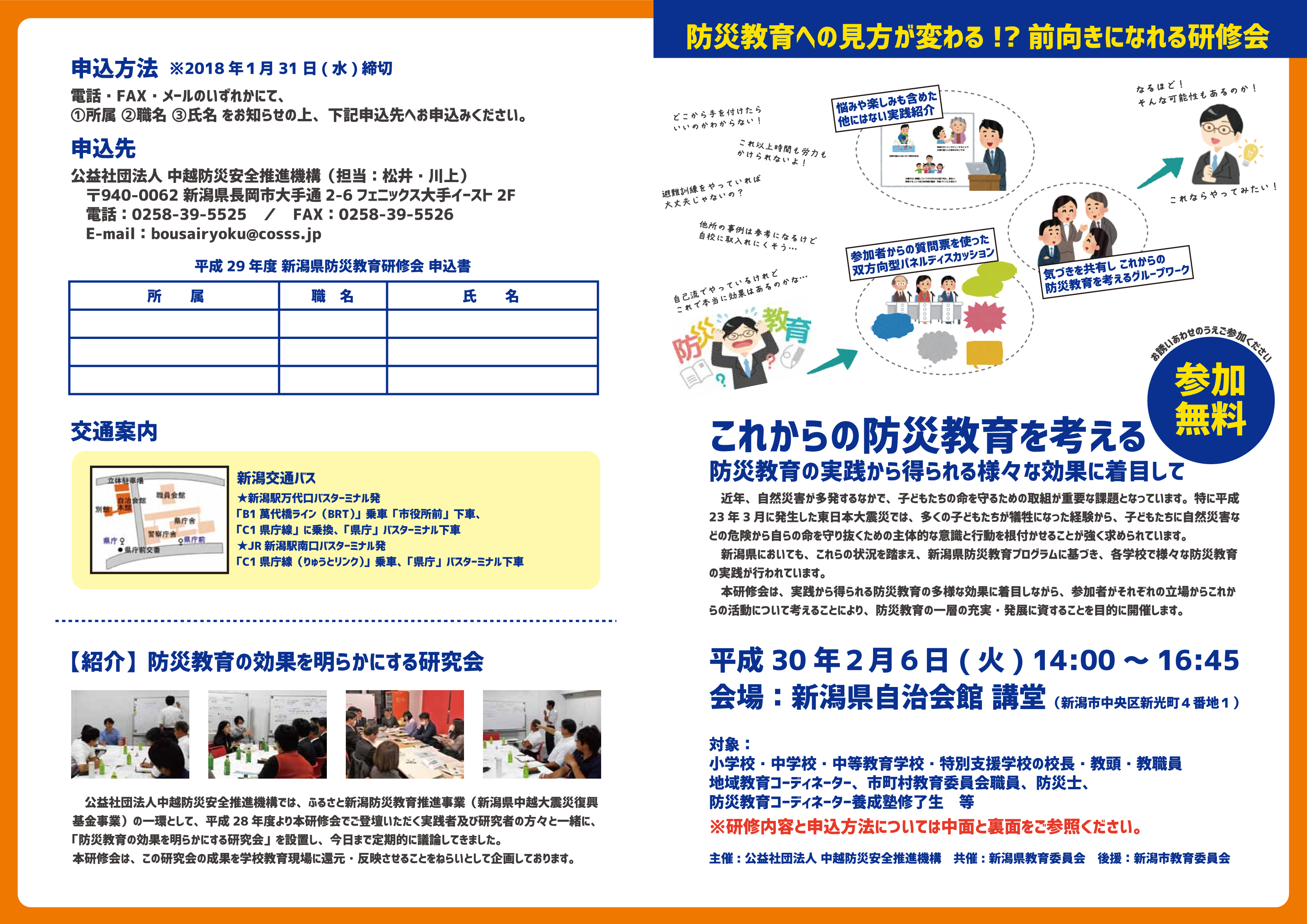 公益社団法人中越防災安全推進機構主催による防災教育研修会が、平成30年2月6日(火)新潟県新潟市で開催されます。